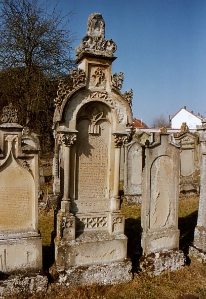 Sehenswerte Grabsteine auf dem Friedhof in Oettingen, im Bild links im Hintergrund das Taharahaus (Aufn. J. Hahn, 2004)