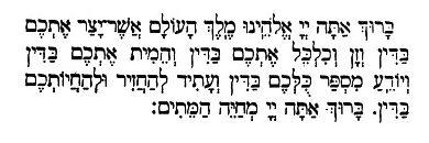 Ihre Übersetzung lautet: „Gelobt seist du, Ewiger, unser Gott, König der Welt; er hat euch in Gerechtigkeit erschaffen, euch in Gerechtigkeit ernährt und erhalten, euch in Gerechtigkeit sterben lassen; er kennt euer aller Anzahl in Gerechtigkeit und wird euch wieder zum Leben zurückrufen in Gerechtigkeit.”