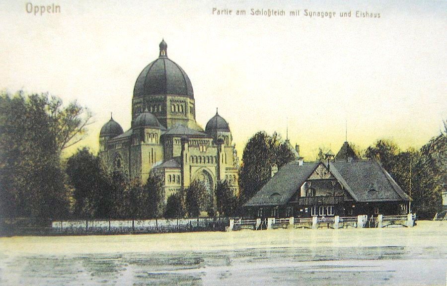 links: Neue Synagoge in Oppeln (Aufn. um 1930, aus: wikipedia.org, CCO) - rechts: hist. Bildpostkarte