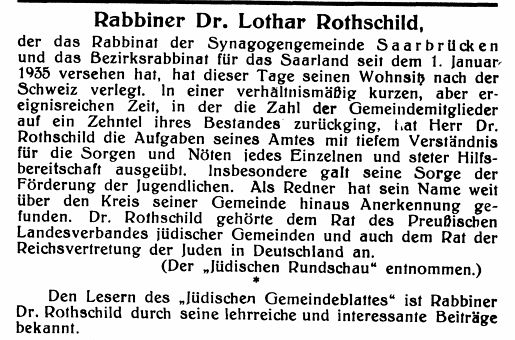 Im Mai 1939 lebten nur noch 173 Juden in Saarbrücken. Das Schrumpfen der jüdischen Gemeinde führte dazu, dass der Synagogenvorstand nicht mehr dem Gemeindestatut entsprechend besetzt werden konnte; so wurden die Gemeindegeschäfte bereits ab Frühjahr 1936 kommissarisch durch den Saarbrücker Rechtsanwalt Oskar Schloß wahrgenommen. Der seit 1935 in Saarbrücken tätige (und damit letzte) Rabbiner, Dr. Lothar Simon Rothschild, gab sein Amt auf und emigrierte 1938 in die Schweiz.