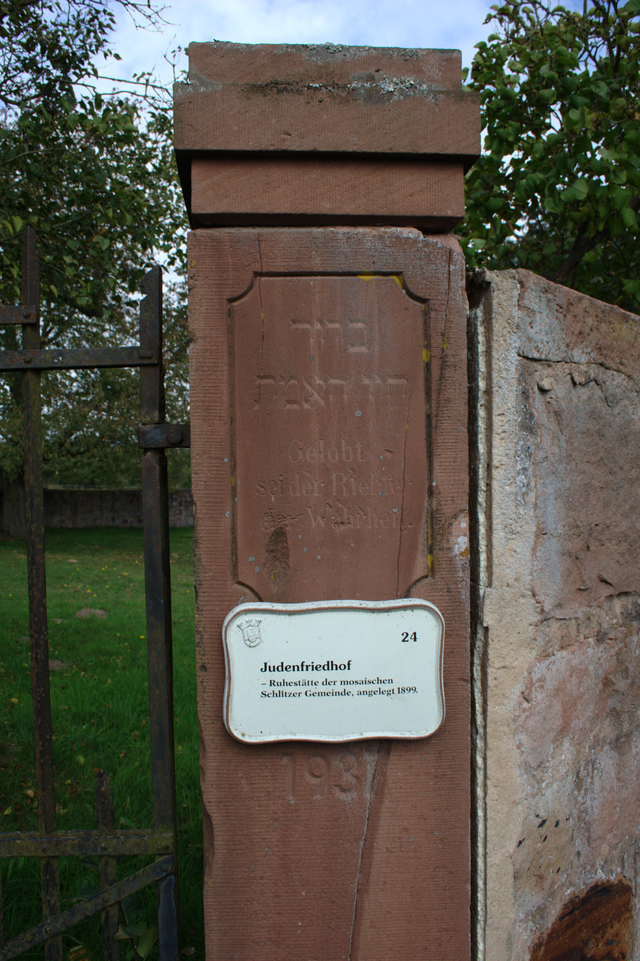 jüdischer Friedhof Schlitz - originaler Eingangspfeiler (beide Aufn. U., 2012, aus: wikipedia.org, CC BY-SA 3.0)