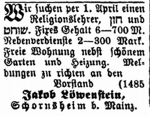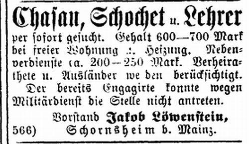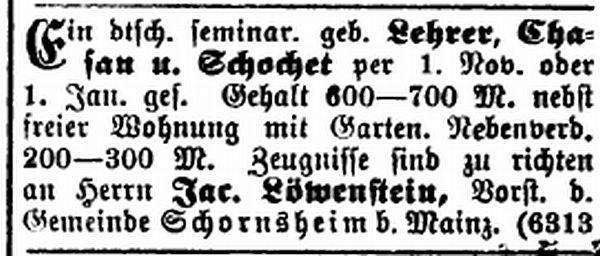 Schornsheim (Rheinhessen), 10.August. Es dürfte die Leser Ihres geschätzten Blattes interessiren, zu erfahren, daß auch in der hiesigen Gegend, wo es mit den religiösen Zuständen wie Schechita, Mikwe und dergleichen mehr, leider sehr traurig aussieht, doch noch Jehudim sind, die für die religiösen Gebräuche Sinn haben, wenn sie zur dazu angeeifert werden. Schon seit einigen Jahren war unsere Mikwe ganz vernachlässigt, infolge dessen auch nicht gebraucht, aber auf Veranlassung uns. jetzigen Herrn Lehrer Eisenberger hat die Gemeinde die Mikwe nach Angabe eines religiösen Rabbiners wieder neu renoviren lassen. ... Möge es unserem Lehrer gelingen, noch viel Gutes in unserer Gemeinde zu stiften. Auch unsere Synagoge ist ganz neu renovirt, und haben die Gebr. Löwenstein aus New York, Brüder unseres Vorstehers, 2000 M. dazu gegeben.