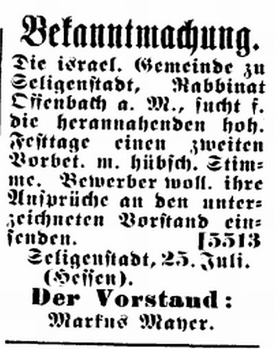 Stellenanzeigen aus: „Allgemeine Zeitung des Judentums" vom 20.Dez. 1858 und "Der Israelit" vom 30.Juli 1900