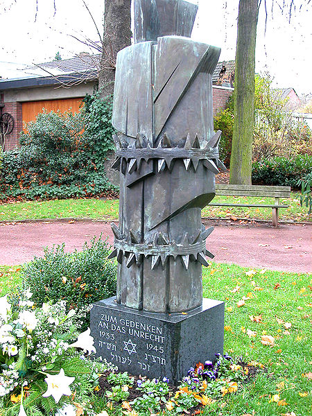 1969 wurde auf dem jüdischen Friedhof - dieser war im November 1938 weitgehend zerstört worden und besitzt heute nur noch sechs Grabsteine - ein Mahnmal errichtet (Aufn. V., 2009, aus: wikipedia.org, gemeinfrei).