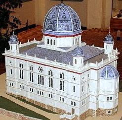 Teplitzer Synagoge (hist. Postkarte um 1920, aus: wikipedia.org, CCO)       -       Synagogenmodell (aus: wikipedia.org, CCO)