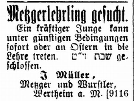 Auf Wunsch der SA. wurde am Montag mittag um 2 Uhr die Schließung aller jüdischen Geschäfte erzwungen. Da jedoch gegen jüdische Geschäfte, Warenhäuser und Ramschbuden, Filialgeschäfte einheitlich vom Reich vorgegangen werden wird und Einzelaktionen vom Innenminister Frick verboten wurden, durften nach 2 Stunden die Geschäfte wieder öffnen. Wir fordern aber die Landbevölkerung auf, ihrer Gesinnung nach jüdische Geschäfte grundsätzlich zu meiden und keinen Handel mit Juden zu treiben. ... Denkt daran, daß die Wertheimer Juden den kommunistischen Aufmarsch durch Geldspenden unterstützt bezw. in Szene gesetzt haben. ... Bewohner von Stadt und Land, vergeßt nicht, was Reichsminister Göring in seiner Essener Rede gesagt hat: