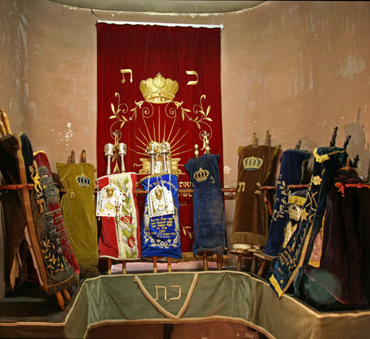 Synagogenfront (Aufn. Olevy 2009, aus: wikipedia.org, CC BY-SA 3.0) und restaurierter Innenraum (Aufn. Fill, 2014, aus: wikipedia.org, CC BY-SA 4.0)