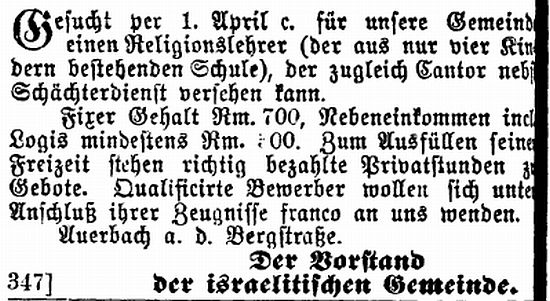 Die Auerbacher Gemeinde gehörte zum Rabbinatsbezirk Darmstadt II.