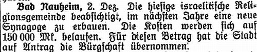 Bad Nauheim hat nun eine neue Synagoge, in strengster Sachlichkeit und schönster Zweckmäßigkeit, erbaut vom Architekten Richard Kaufmann in Frankfurt a.M. Ein langjähriger Traum der Gemeinde Bad Nauheim ist damit in Erfüllung gegangen. In ihrer Anlage bildet die Synagoge auch einen Schmuck der Stadt. Überall in der Welt, wo man im jüdischen Kreise das Heilbad Nauheim kennt und liebt, wird die Kunde von diesem neuen Gotteshause anstelle des alten Baues, der im Sommer die Beter längst nicht mehr fassen konnte, große Freude auslösen. Wie das Gotteshaus selbst, so schön und sachgemäß sind die Nebenbauten errichtet, wie Schulzimmer, Beratungszimmer, kleine Wintersynagoge. Besondere Erwähnung verdient das Tauchbad, das bei allem modernen Komfort genauestens nach den Vorschriften des Gesetzes errichtet wurde. ....