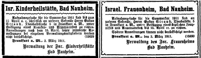 Wegen des Kurbetriebes hielten sich auch zahlreiche Juden aus dem Ausland hier auf; in den Jahrzehnten vor dem Ersten Weltkrieg waren es besonders orthodoxe Juden aus ganz Europa. In Bad Nauheim gab es seit der Mitte des 19. Jahrhunderts diverse jüdische Kurheime und -einrichtungen; zu den bekanntesten zählten das Israelitische Männerheim, das Israelitische Frauenheim und die Israelitische Kinderheilstätte.