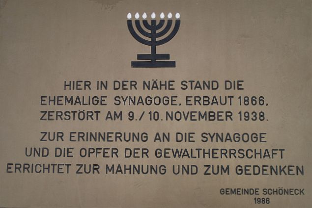 Anlässlich des 70.Jahrestages der Reichspogromnacht wurde am ehemaligen Rathaus ein Gedenkstein mit -tafel aufgestellt (Aufn. J. Hahn, 2009), die die folgende Inschrift trägt: