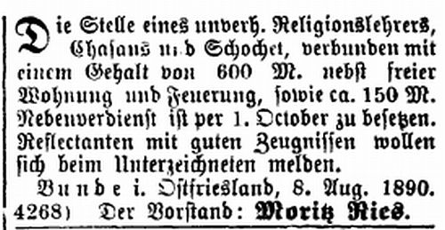 Seit den 1850er Jahren hatte es in Bunde eine jüdische Elementarschule gegeben, die von der Judenschaft unterhalten wurde; die hierher verpflichteten Lehrer wechselten aber sehr häufig, sodass ein kontinuierlicher Unterricht nicht gegeben war. Als Religionsschule blieb diese Schule bis in die 1920er Jahre bestehen: Häufiger Lehrerwechsel kennzeichneten die Situation im Schulbetrieb; so sollen in den Jahren 1882 bis 1905 elf (!) jüdische Lehrer dort ihren Dienst verrichtet haben.