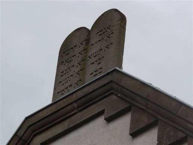 Synagogengebäude (Aufn. Hochstrasser, 2012, aus: wikipedia.org, CC BY-SA 3.0) und Gebotstafeln (Aufn. J. Hahn, 2007)