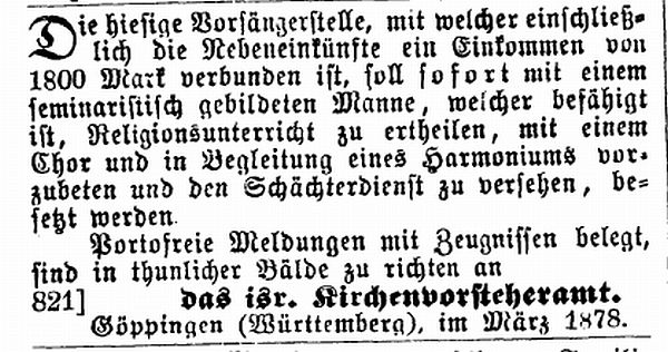 Anzeigen aus: "Allgemeine Zeitung des Judentums" vom 10.März 1874 und der Zeitschrift "Der Israelit" vom 13.März 1878