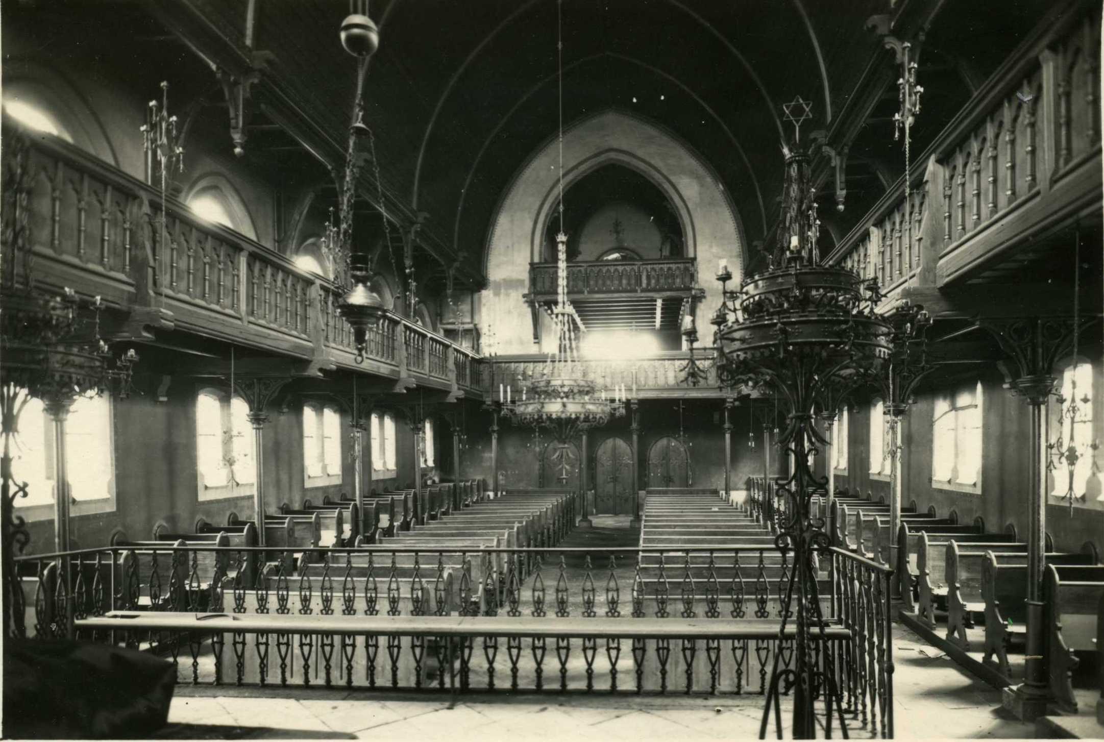 Frontansicht der (neuen) Synagoge (hist. Aufn) und Synagogeninnenraum (Muzeum Velké Meziříčí)