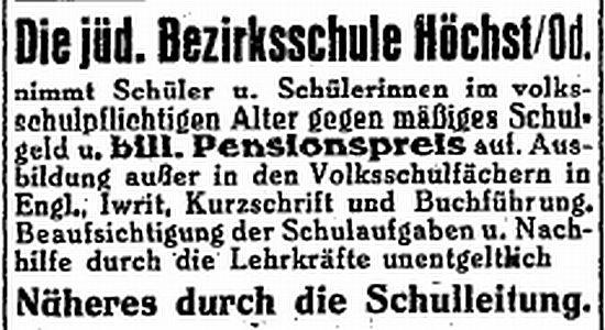 Nachdem die jüdischen Kinder ab 1935 die öffentlichen Volksschulen nicht mehr besuchen konnten, gründete der seit 1900 in Höchst tätige Lehrer Hermann Kahn - mit Unterstützung der Reichsvereinigung der deutschen Juden - eine jüdische Bezirksschule in Höchst; diese wurde in der Folgezeit von Kindern im schulpflichtigen Alter aus bis zu neun umgebenden Gemeinden besucht.