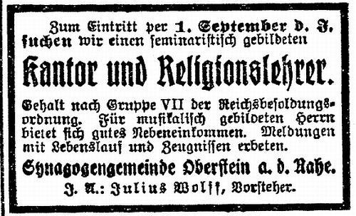 Eine jüdische Elementarschule gab es in Oberstein seit Beginn des 19.Jahrhunderts; sie wurde als jüdische Privatschule geführt, d.h. der Lehrer wurde von der Gemeinde bezahlt. Um 1895 wurde die Schule wegen Schülermangels vorübergehend geschlossen, ab 1902 dann wieder betrieben.