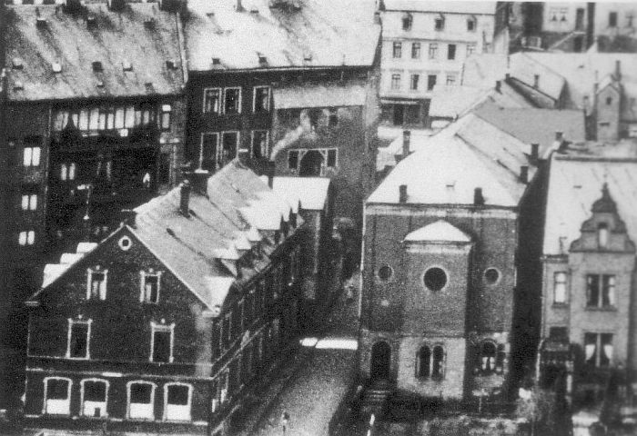 ... Die spontanen Demonstrationen gegen die Juden richteten sich im wesentlichen gegen das Haus, in dem den Juden der Haß gepredigt wird - gegen die Synagoge in der Austraße Oberstein. Eine Schar empörter Männer drang in die Synagoge ein, zertrümmerte die Inneneinrichtung mit Äxten und anderen Werkzeugen und legte dann Feuer an, so daß die Synagoge vollkommen ausbrannte. Ein Weitergreifen des Brandes über das Haus hinaus wurde durch die Feuerwehr verhindert. Den ganzen Tag standen große Scharen vor dem ausgebrannten Gebäude, aus dem verkohlte Balken herausragten und gaben ihrer Genugtuung über diese spontane Aktion unverhohlen Ausdruck.