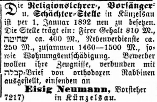 Ein seitens der Kultusgemeinde angestellter Lehrer war zugleich auch als Vorbeter und Schochet tätig.