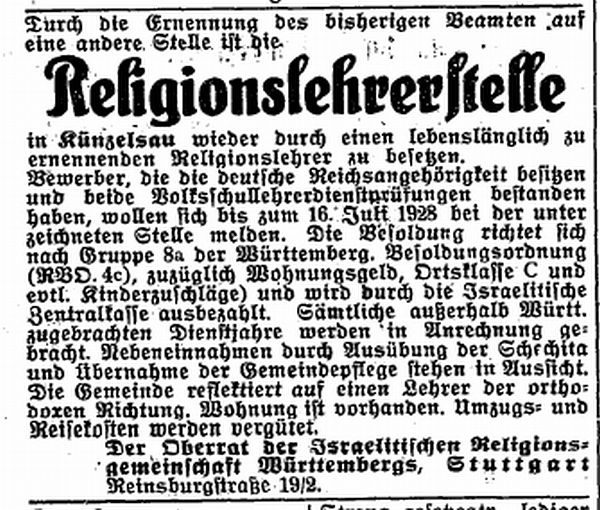 Julius Schapiro, Die Israeliten im Bezirk Künzelsau, in: 100 Jahre ‘Kocher- und Jagstbote’, Jubiläumsausgabe vom 2.1.1928