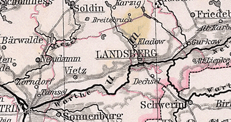 Das ehemals brandenburgische Landsberg ist die heutige polnische Großstadt Gorzow Wielkopolski mit derzeit ca. 122.000 Einwohnern - ca. 80 Kilometer nordöstlich von Frankfurt/Oder gelegen (Ausschnitt aus hist. Karte von 1905, aus: wikipedia.org, gemeinfrei und Kartenskizze 'Polen' mit Gorzow Wielkopolski rot markiert, K. 2005, aus: commons.wikimedia.org, CC BY-SA 3.0).