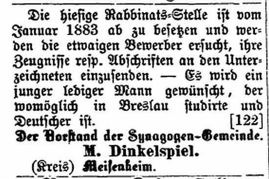 Ausschreibung der Rabbinatsstelle im Meisenheim (aus: "Allgemeine Zeitung des Judentums" vom 7.Mai 1861 und vom 9.Jan. 1883)
