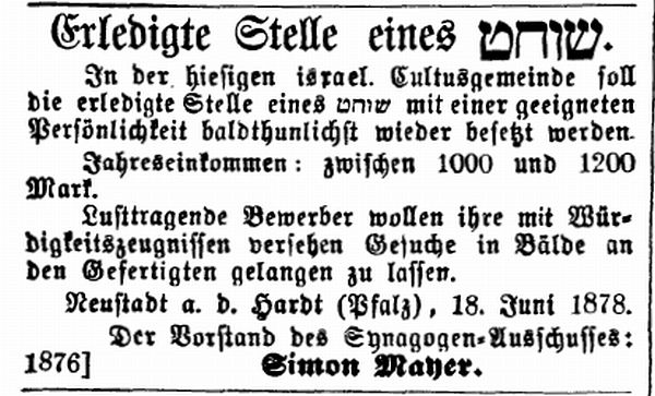 Das Amt des Schächters (Schochet) war in der Gemeinde Neustadt getrennt von dem des Vorbeters/Lehrers - anders als es im allgemeinen üblich war.