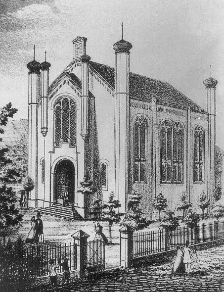 Synagoge in Neustadt a. d. Weinstraße, links: hist. Aufn. - rechts: zeitgenössischer Stich, um 1870 (Stadtarchiv), aus: commons.wikimedia.org, CCO