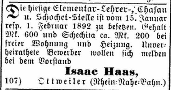 Stellenangebote der Kultusgemeinde Ottweiler in der Zeitschrift „Der Israelit“ vom 22.10.1879 und vom 11.1.1892