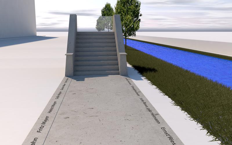 Entwurf der „Treppenskulptur“ (aus: hfg-gmuend.de, 2014) - nach Fertigstellung des "Erinnerungszeichens" (Aufn. Dwagenblast, 2016, aus: wikipedia.org, CC BY-SA 4.0)