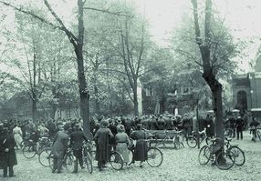 Ausgebrannte Synagoge (Aufn. vom 10.11.1938, aus: kreiszeitung.de) - Schaulustige vor der Synagoge (hist. Museum Verden)
