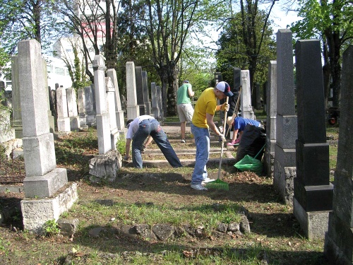 Jugendliche bei Pflegearbeiten (Aufn. W. Sulzgruber) und Teilansicht des jüdischen Friedhofs (Aufn. Museum Wiener Neustadt)